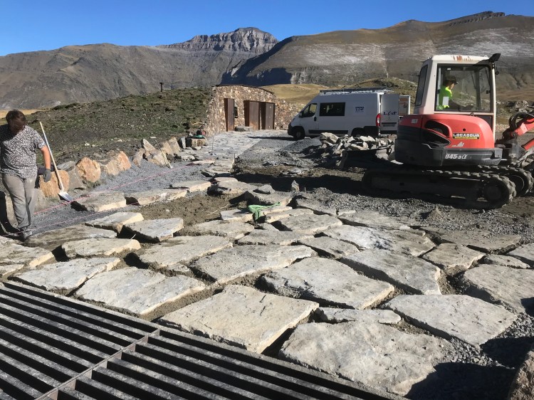 Ensuite, le projet visait à créer une zone d’accueil en haut, au cœur du cirque de Troumouse, zone de dépose et d’attente de navette, toilettes, … tout en permettant l’accès aux services pour le monde pastoral. LBTP a donc ainsi pu aménager les deux points de ce projet, partie basse sur la création des espaces de parkings, murets, … et la partie haute avec dallage naturel, aménagement d’un bâtiment intégré et semi entéré.